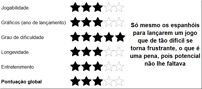 Tal como a generalidade dos jogos espanhóis, o grau de dificuldade é bastante elevado. Mas ao contrário do que se passa na maior parte desses jogos, aqui é extremamente motivante e absorve-nos por completo. Estamos assim perante um jogo a não perder, de forma alguma.