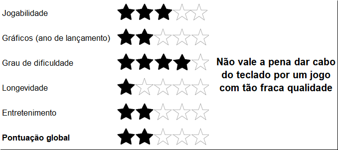 Embora o som seja aceitável, os gráficos são fracos, mesmo para um jogo de categoria budget, como é o caso. Este é daqueles jogos que carregamos uma única vez e que depois deixamos de lado, pois de facto pouco interesse tem.