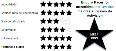E a ideia de Enduro Racer é tudo menos original, mas para o caso também é o que menos interessa. Convertido de um mega sucesso das arcadas, simplesmente temos que conduzir a nossa mota ao longo de 5 percursos, tentando atingir o final sem que para isso se esgote o tempo limite. Sempre que atingimos um dos trechos antes do tempo limite, avançamos para o seguinte, sendo-nos concedido um tempo extra para o novo percurso. E aqui reside a principal pecha de Enduro Racer: os trechos são relativamente pequenos levando a que o jogo não seja muito extenso e que ao fim de algumas tentativas o concluamos.