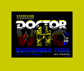 Depois de Deep Blue e Abu Sinver Propagation, Errazking lança um novo jogo em moldes muito semelhantes (mais uma vez criado com o motor 3D Game Maker) para dar entrada no concurso ZX-Dev Conversions, que se aproxima do seu final. Assim, Doctor Who: Surrender Time é baseado na série de ficção científica inglesa dos anos 60, e que já teve outras conversões anteriores, nomeadamente Dalek Attack de 1992, que foi inclusive o último lançamento comercial para o Spectrum na Europa Ocidental.
