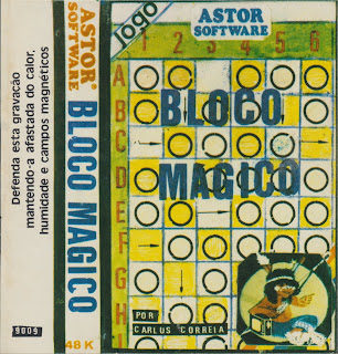 Da parte do Afonso Gageiro chegou-nos mais um interessante jogo da Astor Softare, este criado em 1986 pelo Carlos Correia. E Bloco Mágico tem de facto magia, pois apesar do desafio ser extremamente simples, tal como todos os bons quebra-cabeças, é bastante viciante. Começamos assim a ficar com o catálogo da famosa editora portuguesa bem composto, graças à vossa ajuda, claro, pois o nosso apelo tem surtido efeito e os leitores têm-nos emprestado as suas cassetes.O objectivo em Bloco Mágico é muito simples. Inicialmente é-nos dado uma imagem, constituída por bolas brancas num tabuleiro. Aparece de seguida o tabuleiro, mas com as bolas baralhadas, e "apenas" temos que as movimentar por forma a colocá-las na posição original. Podemos movimentar uma linha ou uma coluna completa carregando na letra ou número respectivos, tentando sempre terminar o desafio no menor número de jogadas.